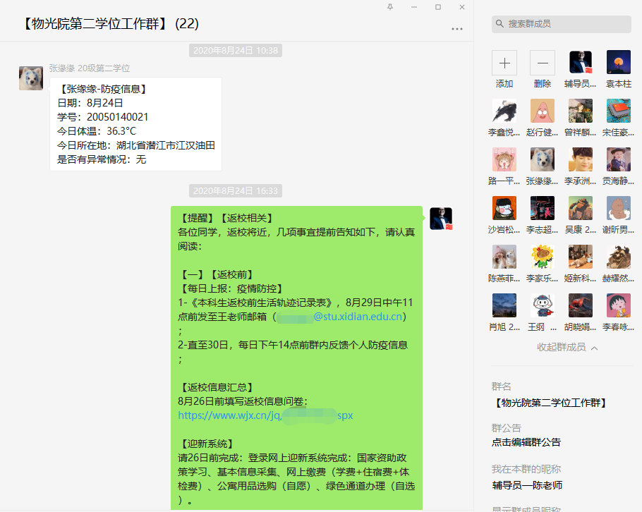 在录取结果公布后,公司辅导员第一时间与员工取得联系,介绍校院基本情况,掌握员工当前学习生活环境和身体状况;建立线上沟通微信群,及时将公司第二学士学位相关讯息通知到位,每日记录员工疫情防控信息,动态更新返校前活动轨迹,逐一前往新生所在宿舍,查看床铺准备情况;来校前,辅导员通过腾讯会议进行线上点名,将报到注意事项、疫情防控要求、新生入学体检等相关事宜进行说明,并就员工关于来校交通、公寓入住、饮食采购等问题进行解答。