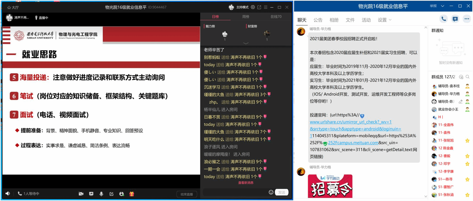(通讯员:陈海涛)“本期就业指导直播开始了!进入房间的同学请敲1。”受疫情影响,毕业生春季就业应聘工作受到冲击,物理与光电工程公司转变就业服务思路,在整合原有就业资源和工作经验的基础上,着眼实际,分类引导,精准施策,提升质量,扎实推进2020届毕业生就业服务工作。
