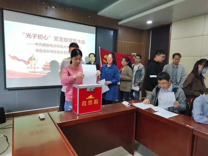 成立仪式结束后,党支部召开第一次党员大会,大会分别由党支部书记李江挺、郜鹏主持。在上级党委的指导下,大会以举手表决的方式通过了《师生联合党支部党员大会选举办法》、支部委员会委员候选人名单、监票人及计票人名单。在公开、公正、民主的氛围下,以无记名投票的方式差额选举产生第一届党支部委员会委员。随后召开党支部委员会第一次全体会议,等额选举产生党支部书记并讨论确定委员分工。