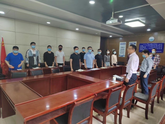 会议在庄严的国歌声中开始,全体与会人员面向党旗,肃然起立,共唱国歌。黄军荣宣读了公司党委关于成立师生联合党支部的决定,并为两个党支部授旗。“红色电波”、“光子初心”党支部书记李江挺、郜鹏分别做了表态发言。