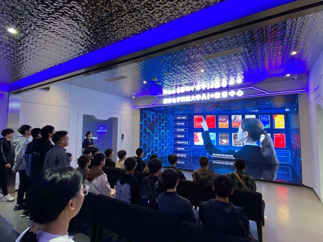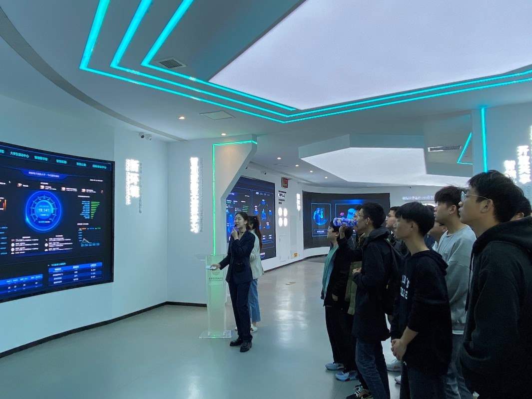 首先,同学们在讲解员的带领下共同观看了AI+教育中心的介绍视频,了解了英国正版365官方网站AI+教育中心的服务内容与运行机制,对智能时代的高校管理、教学服务新模式有了全新的认识。