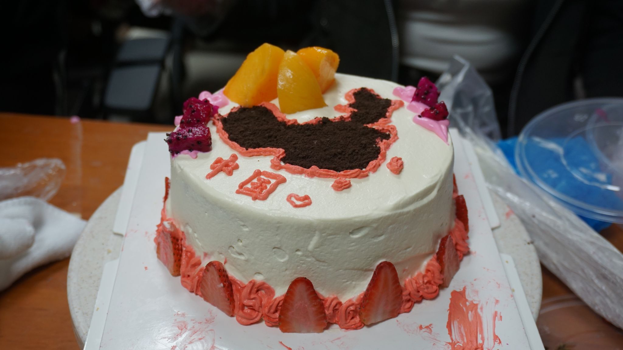活动伊始,首先由蛋糕烘焙老师向同学们讲解蛋糕制作方法、技巧,材料选择及工具使用等基础知识,并展示蛋糕制作全过程。随后,同学们相互协作,用奶油、水果、卡片来装饰蛋糕。在烘焙老师指导下,一起动手参与涂抹奶油、做花边、点缀水果。“75生日快乐”、“我爱你祖国”……同学们纷纷把对祖国的热爱“写”在蛋糕上,展现个人创意与审美,用别样的甜蜜为祖国庆生。