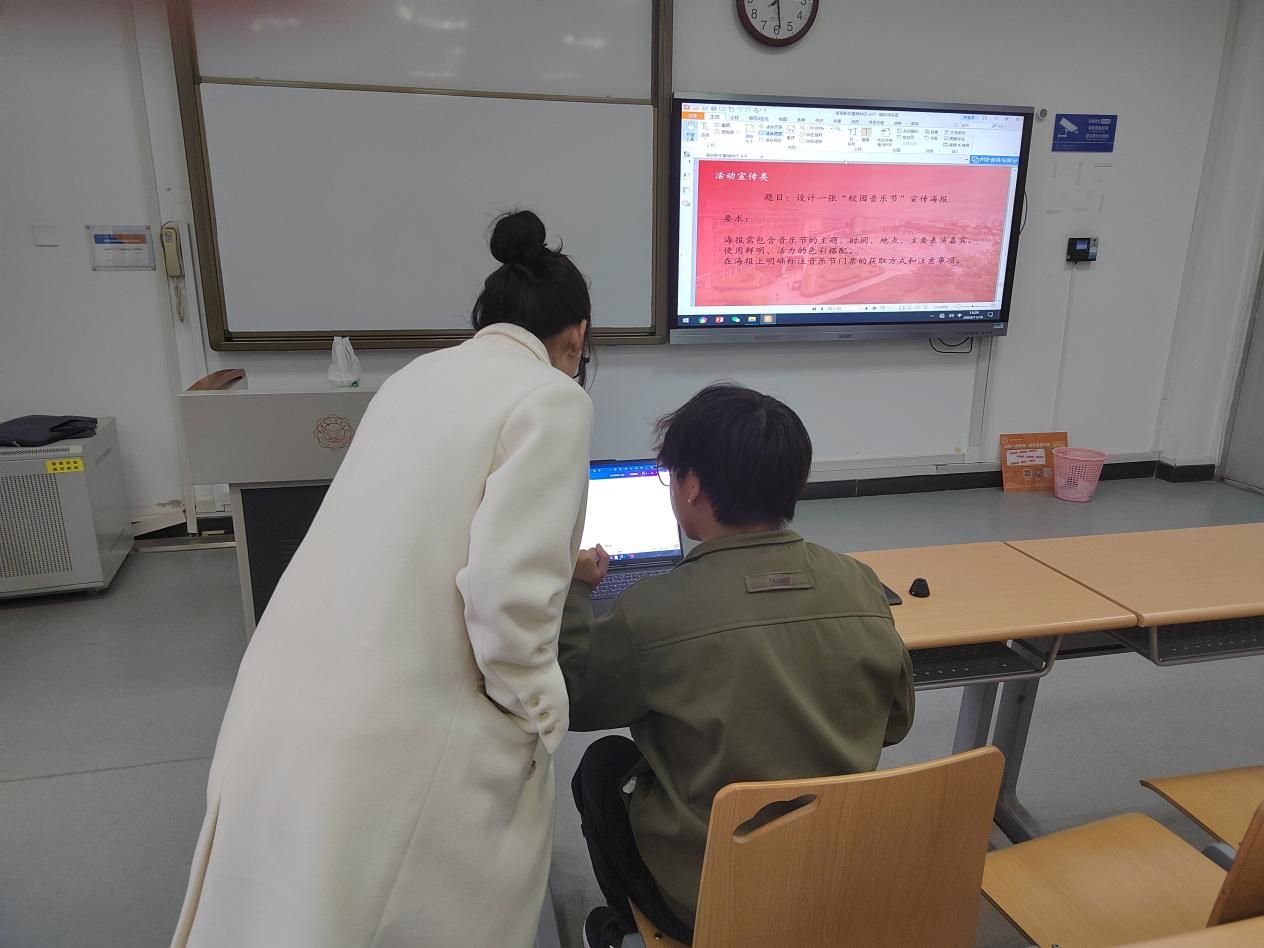 接下来,陈波安将讲解内容接轨至校园海报制作,详细讲述了招募类、活动宣传类等海报的制作方法,并对使用的工具和软件进行了概述。随后她对参与培训的员工干部们进行了点对点的讲解指导,结合自身丰富的海报制作和软件使用经验,耐心细致地解答了同学们在实操过程中出现的各种难题,现场气氛热烈而融洽。