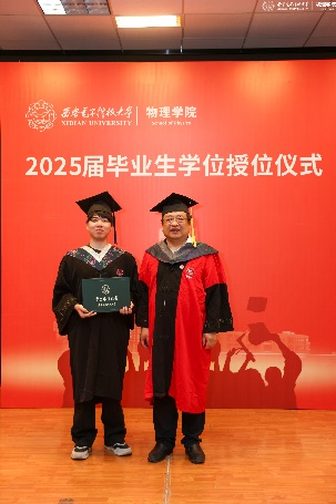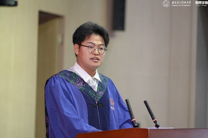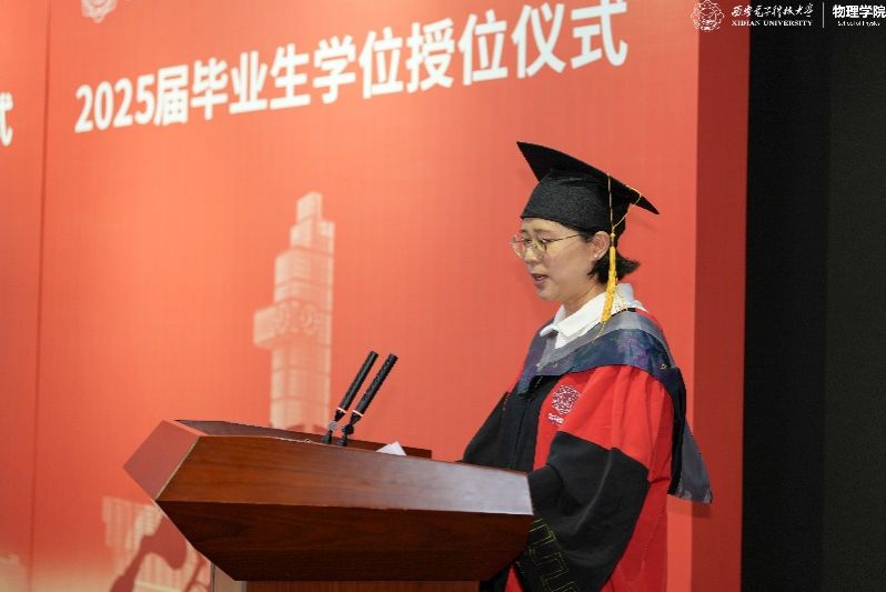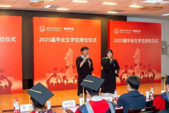 教师代表左炎春寄语同学们,希望同学们无论是投身科研,攻克“卡脖子”难题,还是扎根行业,推动技术创新,都能成为那个敢于突破边界、引领变革的“开拓者”。导师代表李春艳代表老师们真诚祝贺同学们顺利完成学业,同时希望同学们能够继续带着西电赋予的勇气与智慧,在更广阔的天地间:“以信息之刃,解物质之谜;用物理之眼,观天下之势。”